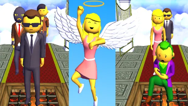 In the beginning, the gates of Heaven open to let in a small group of people awaiting your judgement. Each person comes with one good and bad deed, represented by an angel and devil face, respectively. Swipe up to send them to Heaven, or down to send them to Hell, based on their deeds. Sometimes the decision is easy. For example, if a person donated money to charity and was a serial killer, they’d go to Hell. If they were a devoted wife who lied about being blonde, they’d go to Heaven. However, not all people are that simple. Say a person adopted a stray cat but also didn’t leave a tip. Where should they go? It’s the little things you don’t often think about that makes decision-making difficult. There is the option of skipping the person by watching an ad, though doing so also skips the others behind them.